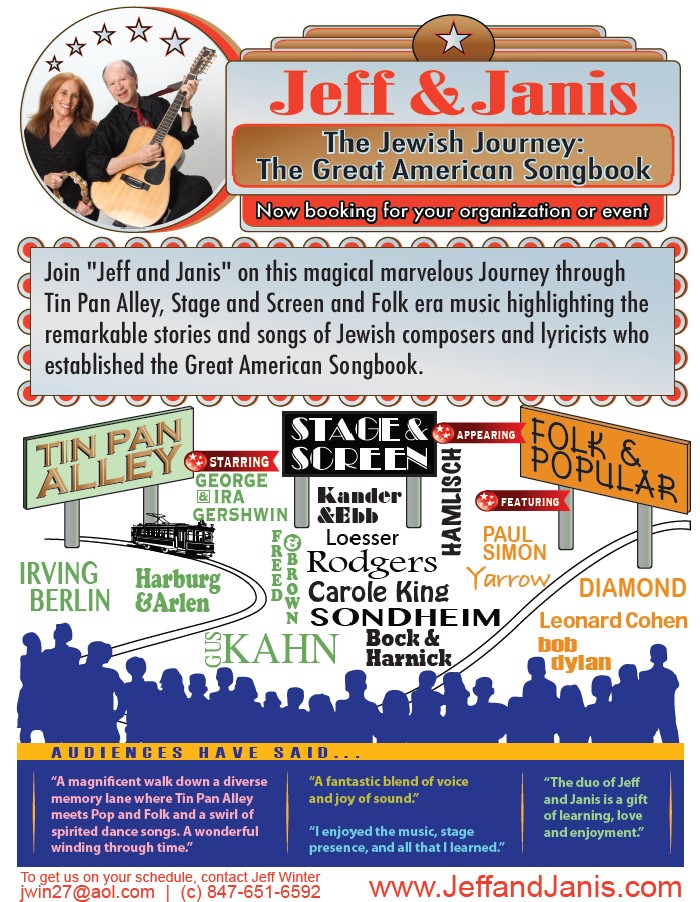 This program presents background about and celebrates musical contributions of Jewish composers and song writers throughout the 20th Century. Jeff and Janis look always that their Jewish background was an important component of their artistic development.